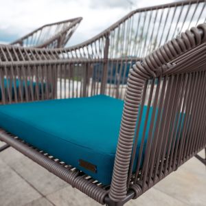 Its integrated backrest and armrests are woven with synthetic cord over a slender yet sturdy metal frame, creating a light and inviting visual effect.